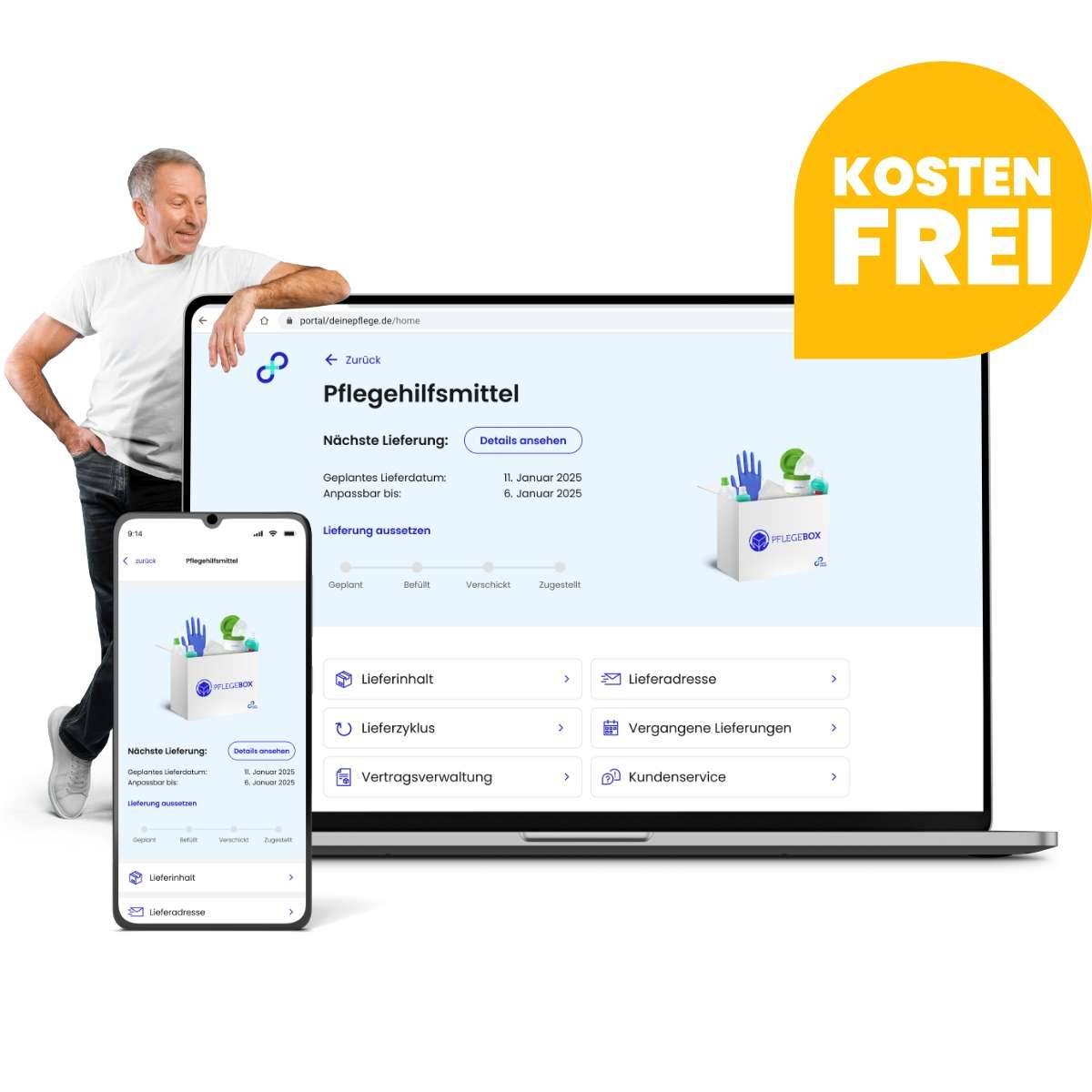 Lass dir regelmäßig kostenfreie Pflegehilfsmittel im Wert von mtl. 42 € (je nach Bedarf und Notwendigkeit) direkt nach Hause liefern.